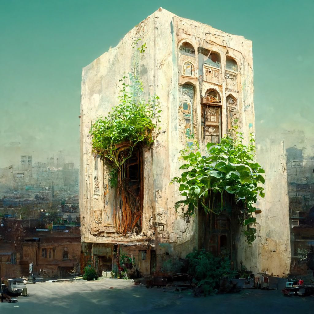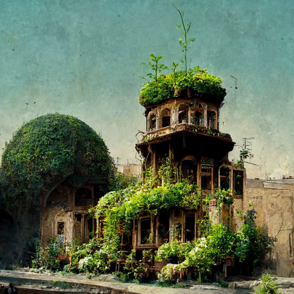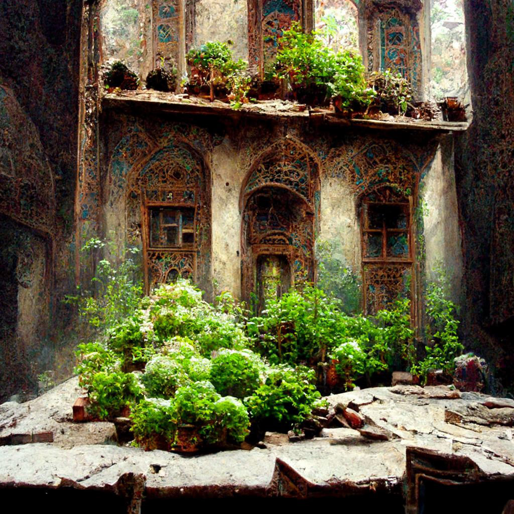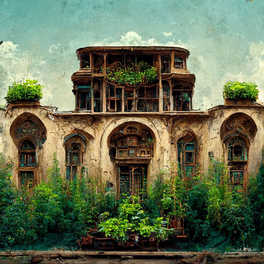 ancient abandoned palace overgrown with lush plants and vines, Persian-style architecture, arched windows, crumbling stone, rooftop garden, nature reclaiming ruins, fantasy post-apocalyptic, highly detailed, soft ambient lighting --v 6 --ar 1:1 --style raw